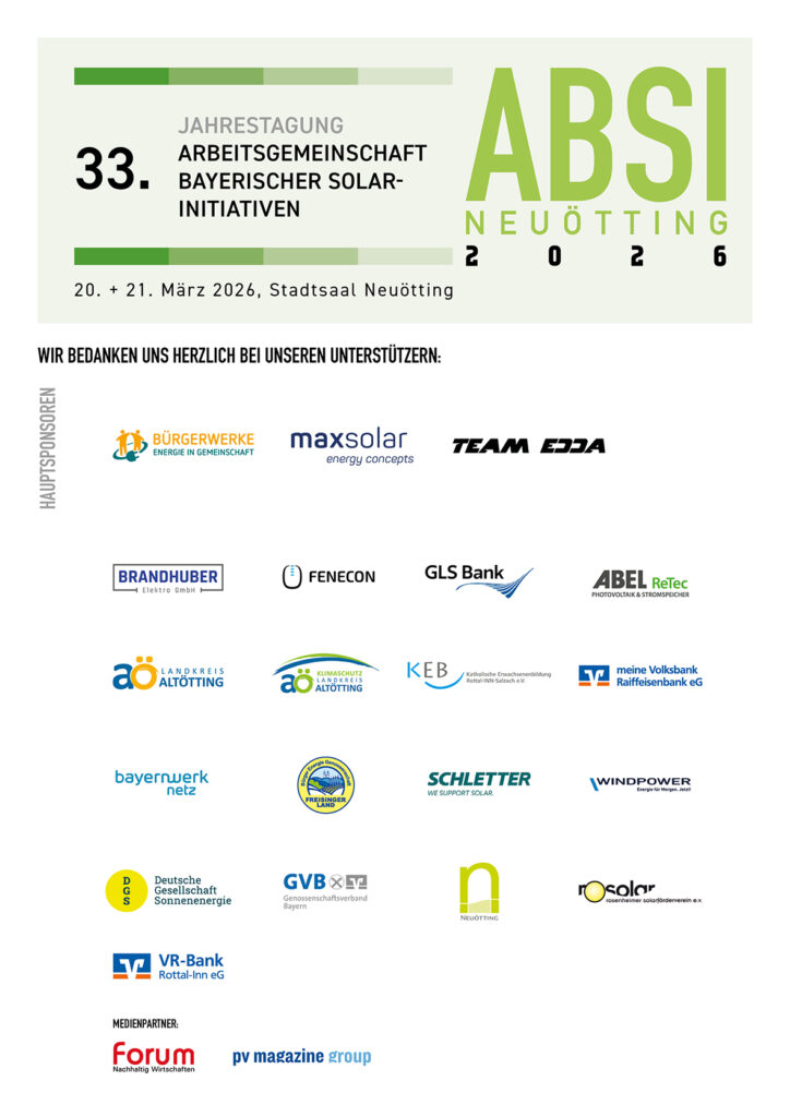 33. Jahrestagung der Arbeitsgemeinschaft Bayerischer Solar-Initiativen (ABSI) am 20. und 21. März 2026 in Neuötting